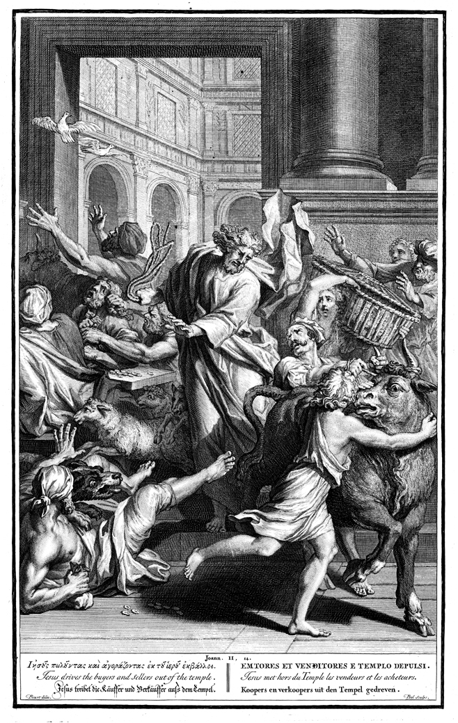 Description: Jesus brandishes a flail of rope as the buyers and sellers create chaos in their scramble to gather their wares and retreat. Engraved by Matthijs Pool (1676-1732) from the design of Bernard Picart (1673-1733).
