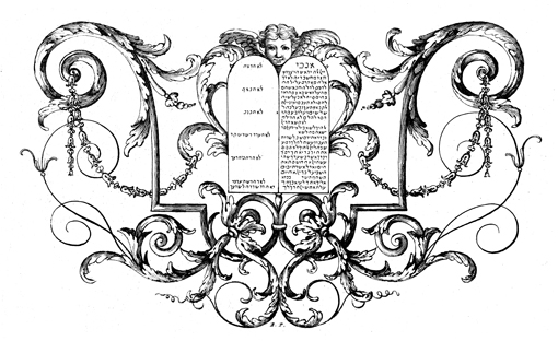 Description: Two tablets with the ten commandments in Hebrew under a smiling cherub’s winged head. Design by Bernard Picart (1673-1733).