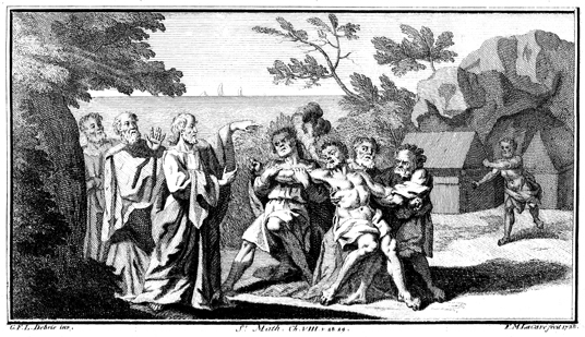 Description: Jesus exorcises a demon from a man who is held back by three others. Engraved by F. M. Lacave from the design of G. F. L. Debrie.