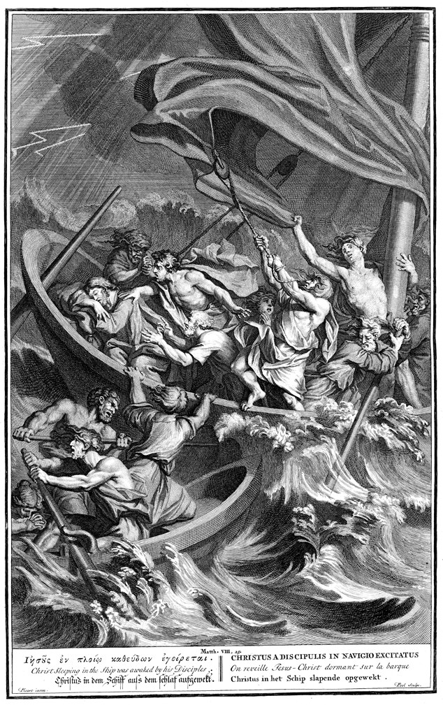 Description: Jesus sleeps in the stern as the crew tries to control the sails and oars. Another, smaller boat rows alongside. Engraved by Matthijs Pool (Poot) (1676-1732) from the design of Bernard Picart (1673-1733).