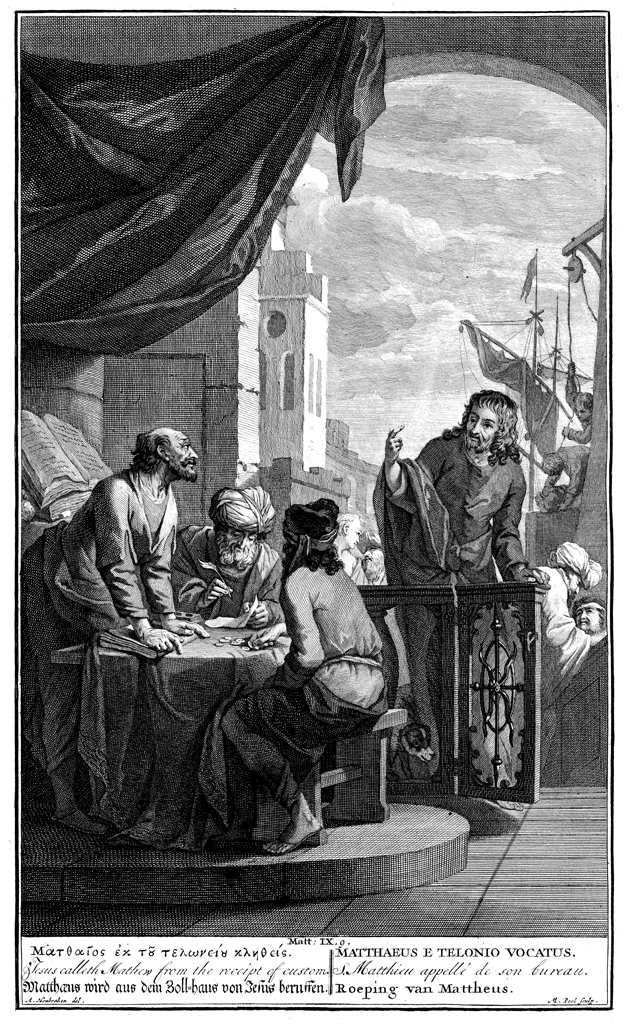 Description: Jesus beckons Matthew, who rises from a table with a look of longing as two other men count money. Engraved by Matthijs Pool (1676-1732) from the design of Arnold Houbraken (Houbrake).