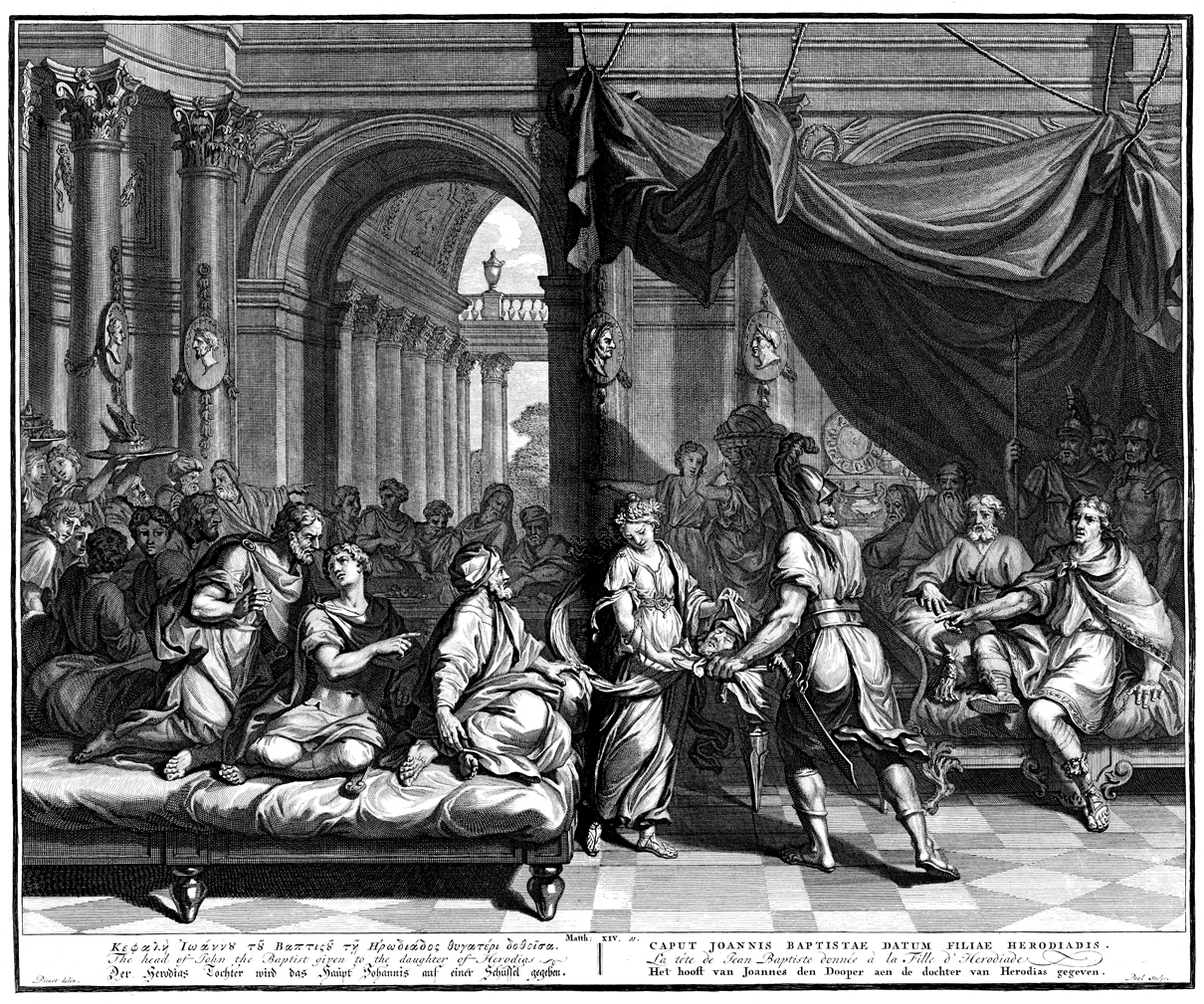 Description: The court looks on as Salome uncovers the head of John the Baptist on the soldier’s platter. Engraved by Matthijs Pool (1676-1732) from the design of Bernard Picart (1673-1733).