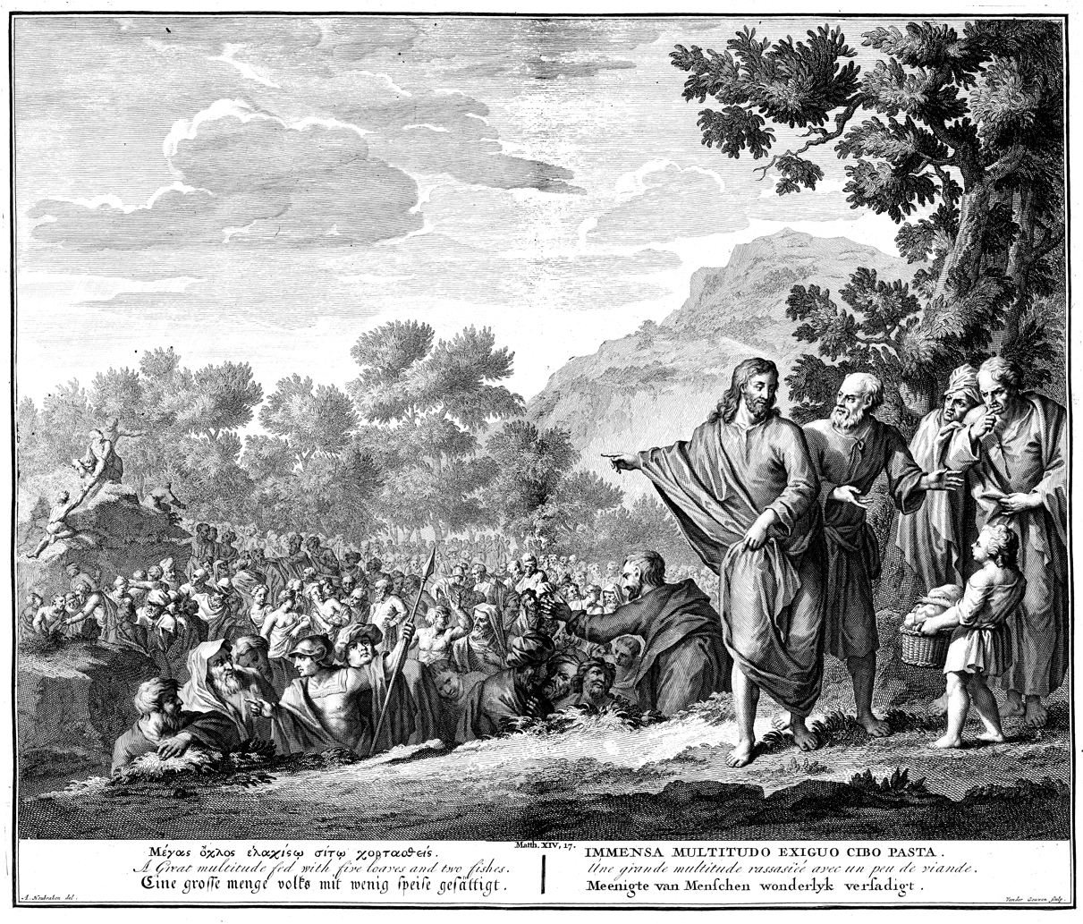 Description: Jesus points to the 5,000 as a child bears a basket of food and the disciples ponder. Engraved by G. vander Gouwen from the design of Arnold Houbraken.