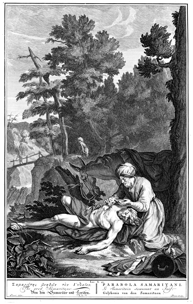 Description: The Good Samaritan kneels over the wounded, stripped man and tends to his wounds. Distant figures ignore the scene. Engraved by J. de Broen from the design of Bernard Picart (1673-1733).