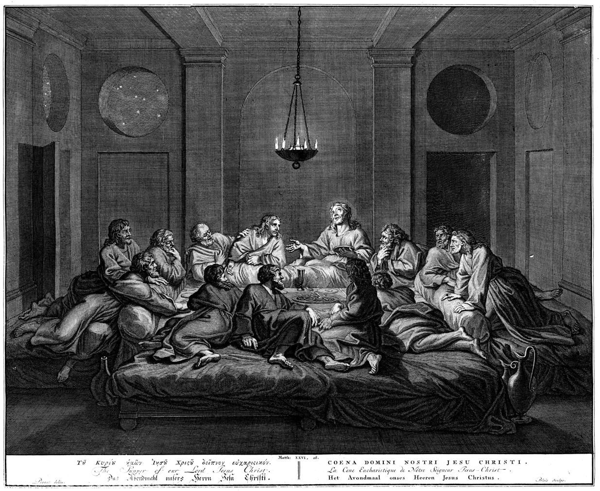 Description: Jesus looks heavenward, plate in hand, as the apostles recline and watch him. The figures are arranged in a circle, a theme echoed by the architecture and rose windows through which constellations shine. Engraved by Abraham de Blois (or Bloys; fl. 1690-1720) from the design of Bernard Picart (1673-1733).
