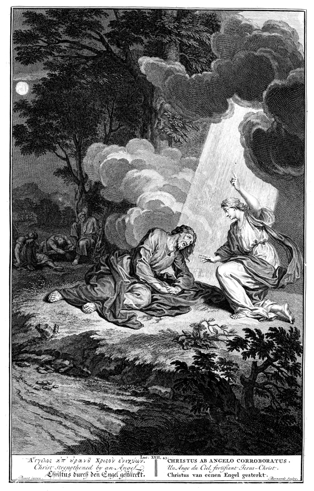 Description: An angel kneels in a beam of light before Jesus, who lies prone and suffering on the ground as the disciples sleep in the background. Engraved by Bernard Picart (1673-1733).
