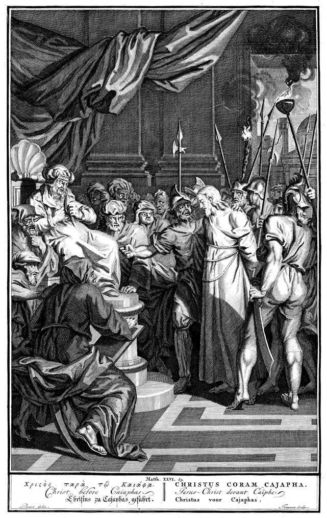 Description: Jesus, bound with ropes and escorted by a mob of soldiers and others, stands before Caiaphas. Engraved by Tongman from the design of Bernard Picart (1673-1733).