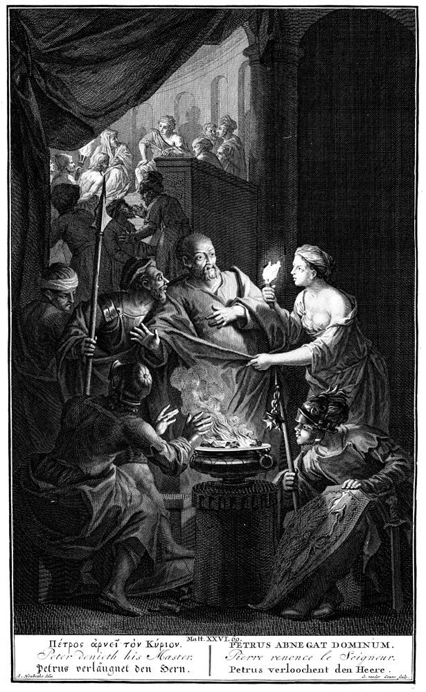 Description: Peter denies Jesus before soldiers and servants as they huddle around a glowing brazier. Jesus’s trial proceeds in the background. Engraved by G. vander Gouwe (Gouwen) from the design of Arnold Houbraken.