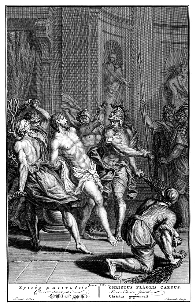 Description: Jesus is flogged with bound branches. Designed by Bernard Picart (1673-1733).