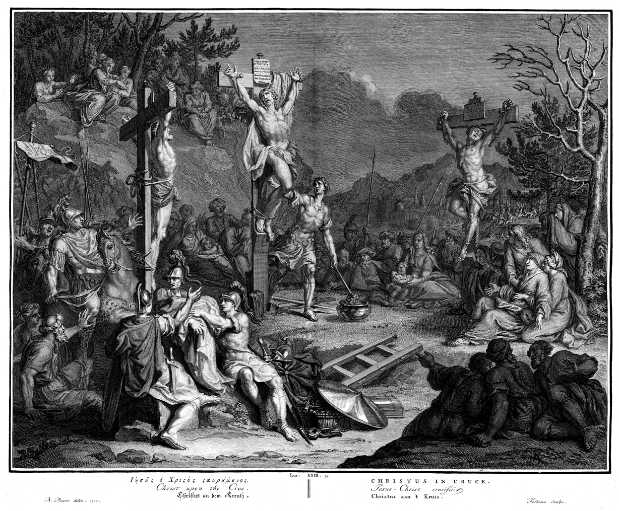 Description: Jesus hangs from the cross with thieves to either side. His mother faints and is supported by John and other women. A soldier wets a sponge in order to slake Jesus’s thirst. Engraved by Jacob Folkema (1692-1767) from the design of Bernard Picart (1673-1733).