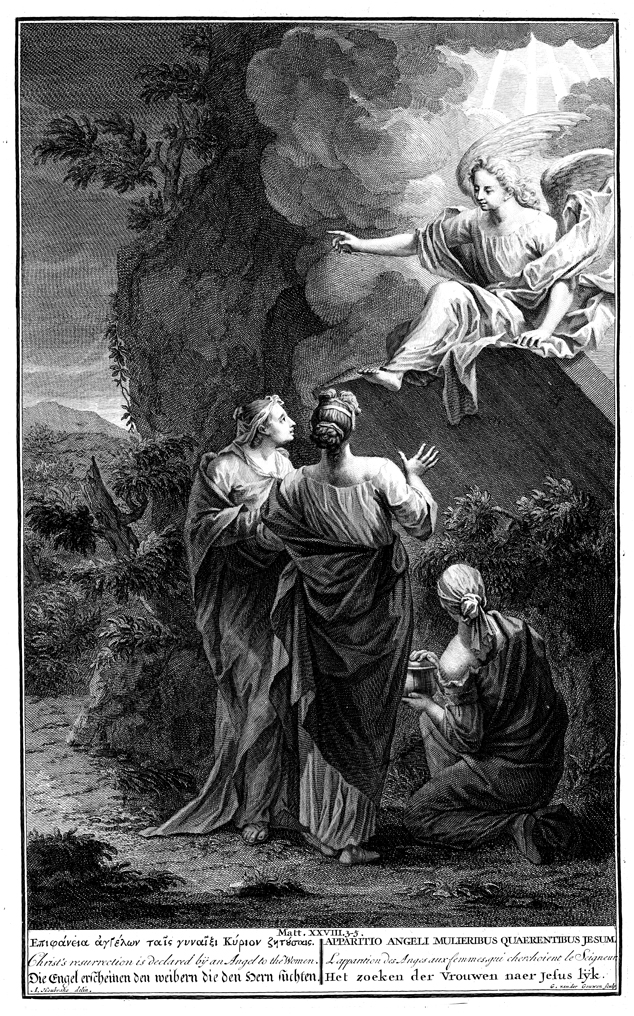 Description: An angel sits atop a stone outcropping and indicates to the three astonished women that Jesus has arisen. Engraved by G. vander Gouwen from the design of Arnold Houbrake (Houbraken).