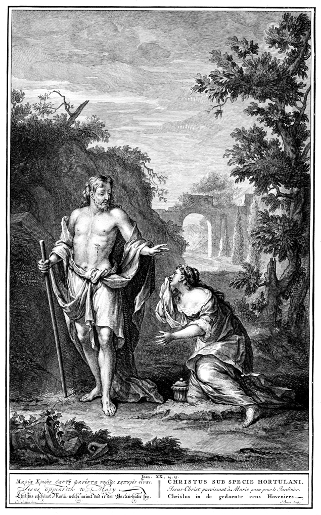 Description: Jesus holds out a hand to prevent the weeping, kneeling Mary Magdalene from touching him. Engraved by J. de Broen from the design of Arnold Houbraken.