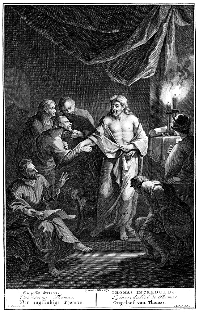 Description: Jesus grabs Thomas’s arm and indicates his wounds as the others look on. Engraved by Arnold Houbraken from the design of Matthijs Pool (1676-1732).
