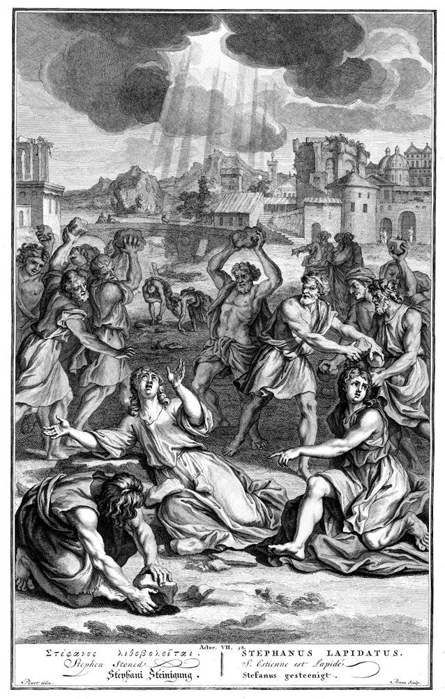 Description: Stephen is stoned to death for his belief. Rays of light break dark clouds to illuminate him, leaving his murderers darkened. Engraved by J. de Broen from the design of Bernard Picart (1673-1733).