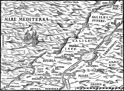Description: A map of the Holy Land depicting several biblical cities and other features.