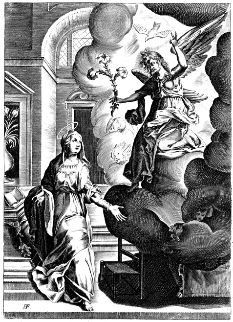 Description: The angel Gabriel visits Mary and announces that she will give birth to Jesus. The artist, Jacques Stella (1596-1657), and the engraver, H. David, are responsible for the etching.