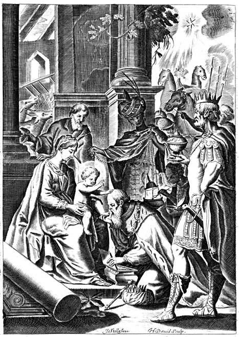 Description: The wise men bring Jesus gifts of gold, frankincense, and myrrh. The artist, Jacques Stella (1596-1657), and the engraver, H. David, are responsible for the etching.