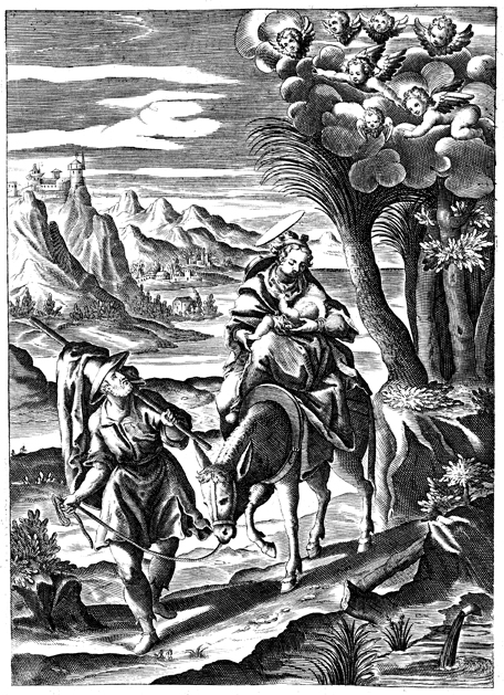 Description: Joseph with Mary and child on a donkey flee to Egypt, as the angels protect and guide them. The artist, Jacques Stella (1596-1657), and the engraver, H. David, are responsible for the etching.