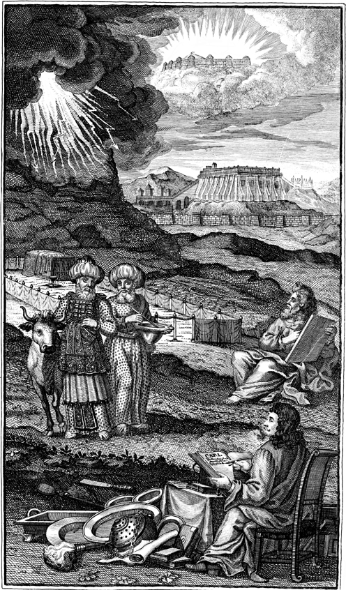Description: Johann Lund writes a book as he views the tabernacle, a theophany at Sinai, the temple, the heavenly Jerusalem, priests in ritual garments, and ritual vessels.