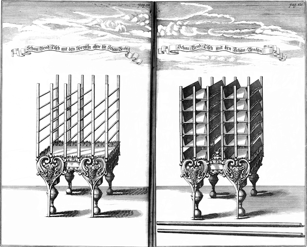 Description: The table of acacia wood made as a place to set the bread of the presence, and to set the plates and dishes for incense and the flagons and bowls for drink offerings.