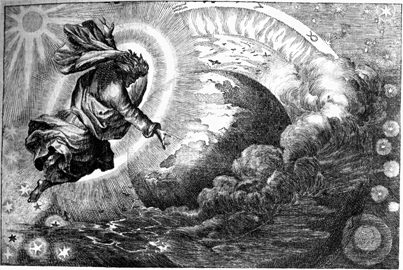 Description: The act of creation is shown as the earth emerges from between the primordial sea (darkness) and firmament (light).
