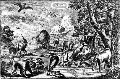 Description: God, represented by a radiating light encircled around the Latin word, “FIAT”, meaning “Let there be,” creates the animals and birds that dwell upon the earth.