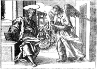 Description: The Evangelist Matthew writes his gospel with his attribute, an angel. In the background, the nativity scene is depicted with Mary, Joseph, and animals surrounding Jesus in a manger.