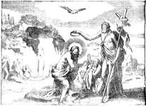 Description: John the Baptist baptizes Jesus in the Jordan River, as the Holy Spirit appears above them in the form of a dove.
