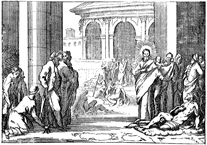 Description: Jesus heals a paralyzed man, who then takes up his mat and walks.