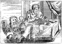 Description: Mark sits at a desk with a book open before him as his attribute, the lion, is nearby.
