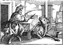 Description: Luke writes his gospel with his attribute, the bull, nearby.