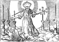 Description: John's vision of the one like the son of man among the seven golden lampstands. John is pictured bowing at his feet.