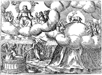 Description: The lamb is worshiped and angels gather the harvest at the end of the age, as God looks on.