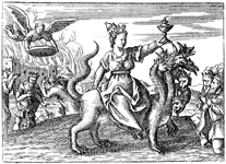 Description: The whore of Babylon rides the beast with cup in hand, while being worshiped by the kings of the earth. In the background, an angel drops a giant millstone as Babylon burns in the background.