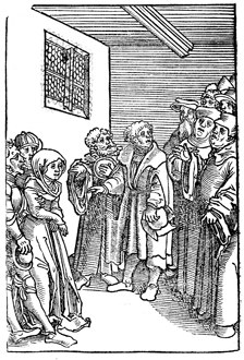 Description: Jewish elders bear false witness against Susanna before a court for refusing to have sex with them, a biblical scene that illustrates the commandment that forbids bearing false witness against one’s neighbor.