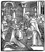 Description: The Eucharist from Martin Luther's (1483-1546) first illustrated Large Catechism, printed in 1530. A Lutheran pastor offers the communicant a wafer during the Eucharist.