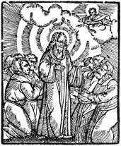 Description: Jesus teaches a group of kneeling people as God watches from the clouds.