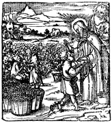 Description: Jesus multiplies five loaves of bread and two fish to feed a crowd of five thousand. Next to him are the baskets of fish and bread.