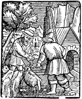 Description: Two men hold a group of sheep with a rope.