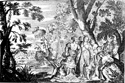 Description: Pharaoh's daughter and her maids rescue Moses from the river and summon his mother to nurse him.