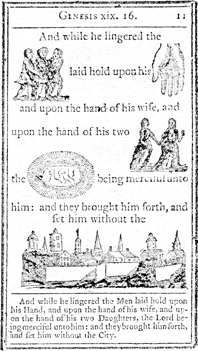 Description: Each page has illustrations to replace major topical items in the passage. In this case, two angels escorting Lot, a hand, Lot's two daughters, and the city of Sodom illustrate the flight from Sodom.