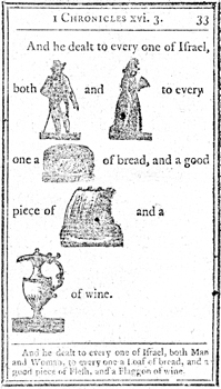 Description: Each page has illustrations to replace major topical items in the passage. In this case, a man, a woman, and a meal are illustrated as a part of the description of King David's offerings.