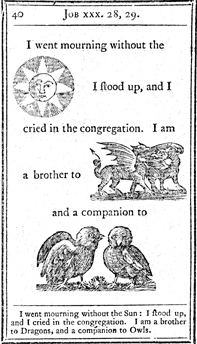 Description: Each page has illustrations to replace major topical items in the passage. In this case, the sun, dragons, and owls illustrate Job's distress.
