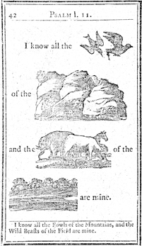 Description: Each page has illustrations to replace major topical items in the passage. In this case, birds, beasts, mountains, and fields illustrate Psalm 50.