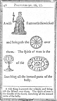 Description: Each page has illustrations to replace major topical items in the passage. In this case, a candle, a king, and a wheel illustrate Proverbs 20.