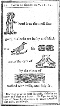 Description: Each page has illustrations to replace major topical items in the passage. In this case, a raven, a pair of doves, and water illustrates the beauty of the male beloved.