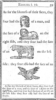 Description: Each page has illustrations to replace major topical items in the passage. In this case, an eagle, a lion, a bull, and human head illustrate Ezekiel's vision of the Living Beings or Cherubim.