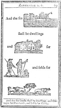 Description: Each page has illustrations to replace major topical items in the passage. In this case, a seaside town, houses, shepherds, and sheep illustrate Zepheniah's passage concerning settlement.