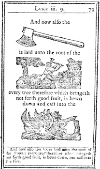 Description: Each page has illustrations to replace major topical items in the passage. In this case, an axe, a woodcutter, and a fire illustrate the coming justice of God.