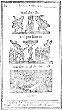 Description: Each page has illustrations to replace major topical items in the passage. In this case, the flogging, crucifixion, and resurrection of Jesus are illustrated.